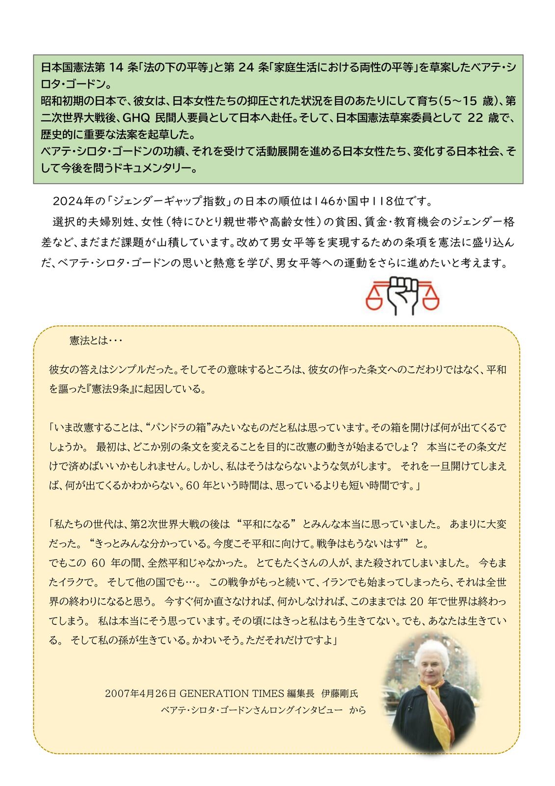 この映画はベアテ・シロタ・ゴードンの功績、それを受けて活動展開を進める日本女性たち、変化する日本社会、そ して今後を問うドキュメンタリーです。