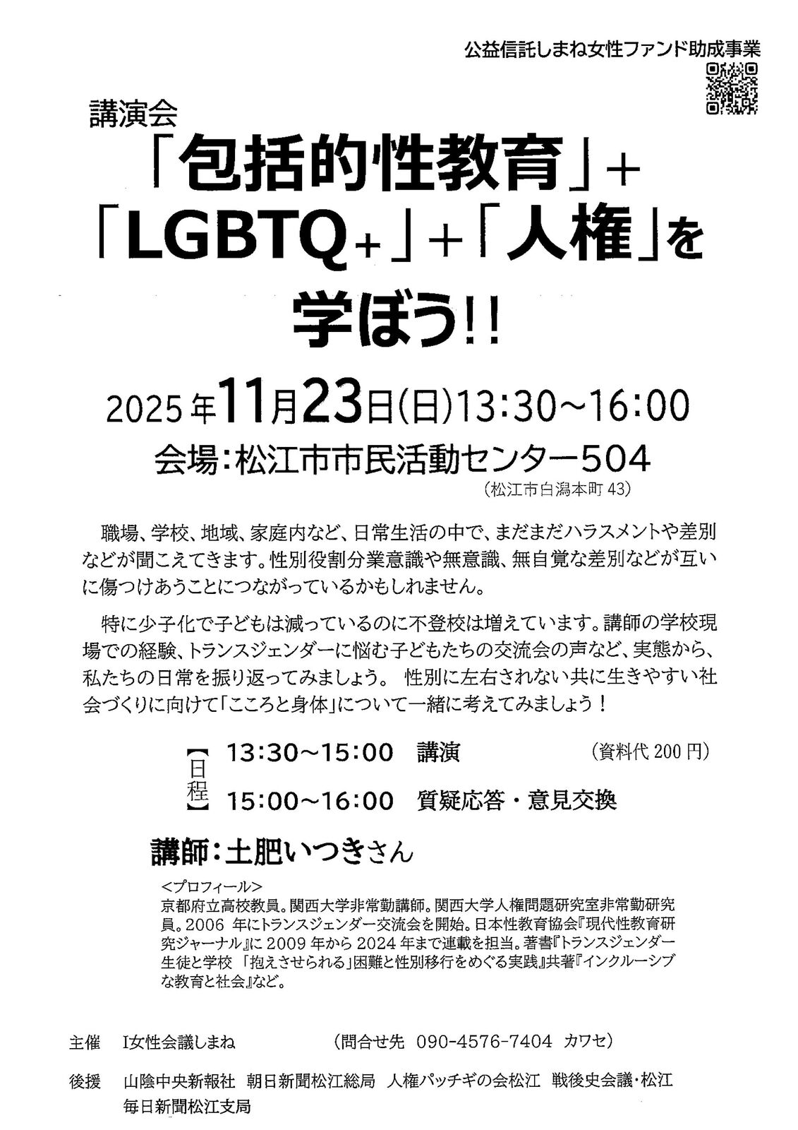 公益信託しまね女性ファンド助成事業講演会「包括的性教育」+「LGBTQ+」 + 「人権」を学ぼう!!