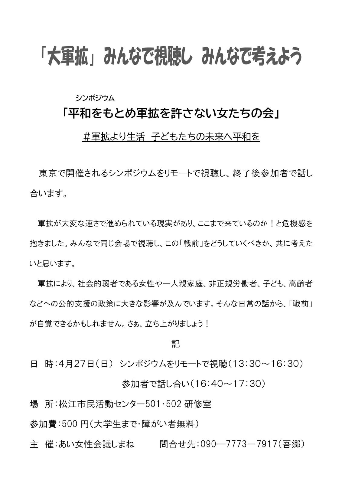 軍拡が大変な速さで進められている現実があり、ここまで来ているのか!と危機感を抱きました。みんなで同じ会場で視聴し、この「戦前」をどうしていくべきか、共に考えたいと思います。軍拡により、社会的弱者である女性や一人親家庭、非正規労働者、子ども、高齢者などへの公的支援の政策に大きな影響が及んでいます。そんな日常の話から、「戦前」が自覚できるかもしれません。さぁ、立ち上がりましょう!